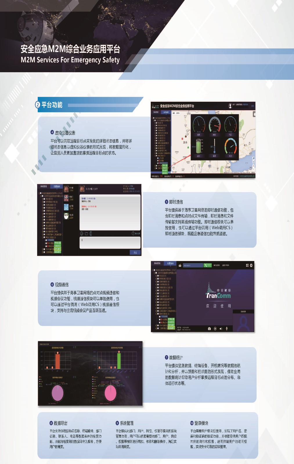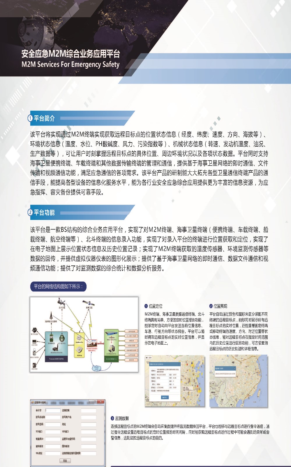 該平臺將實(shí)現(xiàn)通過M2M終端實(shí)現(xiàn)獲取遠(yuǎn)程目標(biāo)點(diǎn)的位置狀態(tài)信息(經(jīng)度、緯度、速度、方向、海拔等)、環(huán)境狀態(tài)信息(溫度、水位、PH酸堿度、風(fēng)力、污染指數(shù)等)、機(jī)械狀態(tài)信息(轉(zhuǎn)速、發(fā)動機(jī)溫度、油況、生產(chǎn)數(shù)據(jù)等),可讓用戶時刻掌握遠(yuǎn)程目標(biāo)點(diǎn)的具體位置、周邊環(huán)境狀況以及各項(xiàng)狀態(tài)數(shù)據(jù)。平臺同時支持海事衛(wèi)星便攜終端、車載終端和其他數(shù)據(jù)傳輸終端的管理和通信,提供基于海事衛(wèi)星網(wǎng)絡(luò)的即時通信、文件傳輸和視頻通信功能,滿足應(yīng)急通信的各項(xiàng)需求,該平臺產(chǎn)品的研制能大大拓充各型衛(wèi)星通信中斷產(chǎn)品的通信手段,能提高各型設(shè)備的信息化服務(wù)水平,能為各行業(yè)安全應(yīng)急綜合應(yīng)用提供更為豐富的信息資源,為應(yīng)急指揮、容災(zāi)備份提供可靠手段。