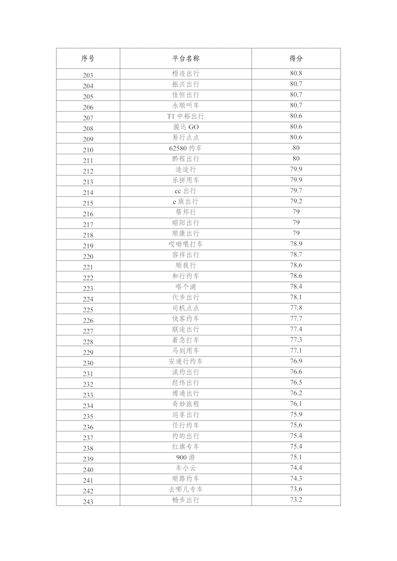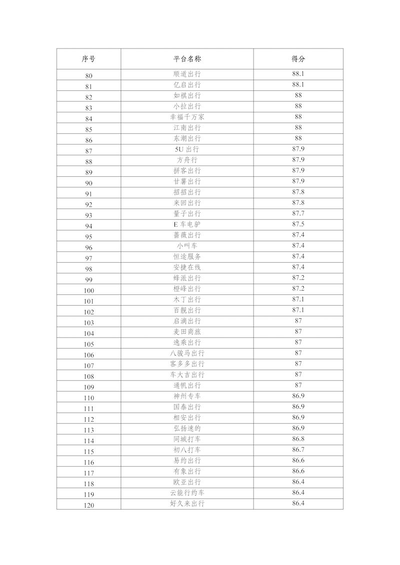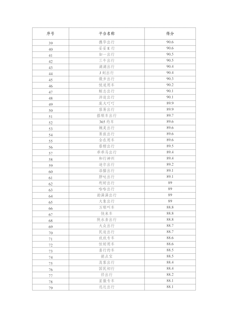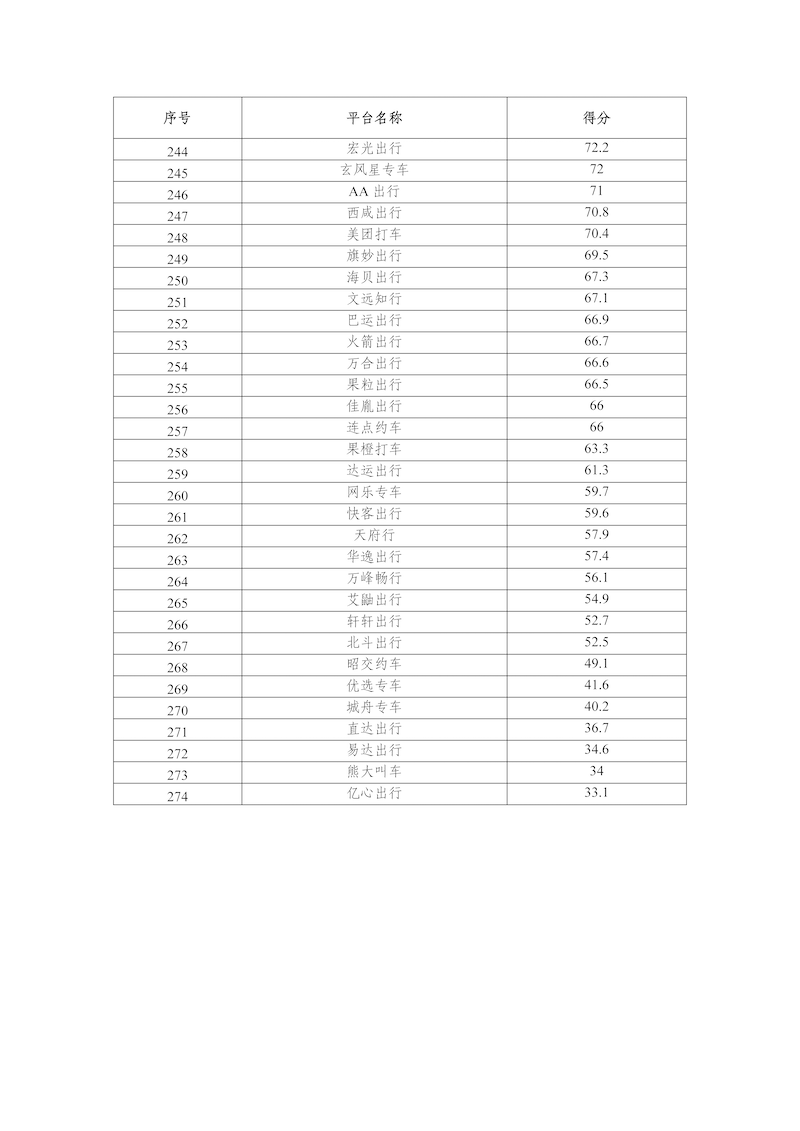 2025年10月,網(wǎng)絡(luò)預(yù)約出租汽車監(jiān)管信息交互平臺共收到274家網(wǎng)約車平臺公司傳輸?shù)臄?shù)據(jù),按數(shù)據(jù)完整性、規(guī)范性、及時性、真實性等指標評分共100分計算,平均得分為88.0分,各網(wǎng)約車平臺公司數(shù)據(jù)傳輸質(zhì)量具體情況附后。