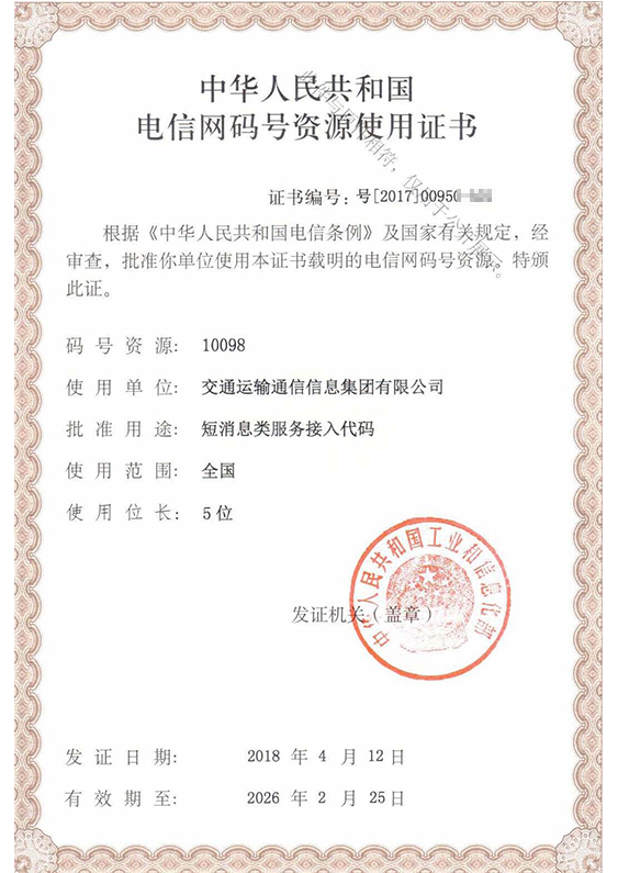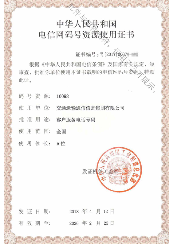 資質(zhì)名稱:電信網(wǎng)碼號(hào)資源使用證書10098(2)