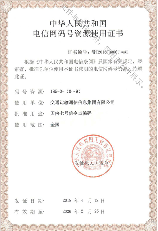 資質(zhì)名稱:電信網(wǎng)碼號(hào)資源使用證書185-0-(0~9)